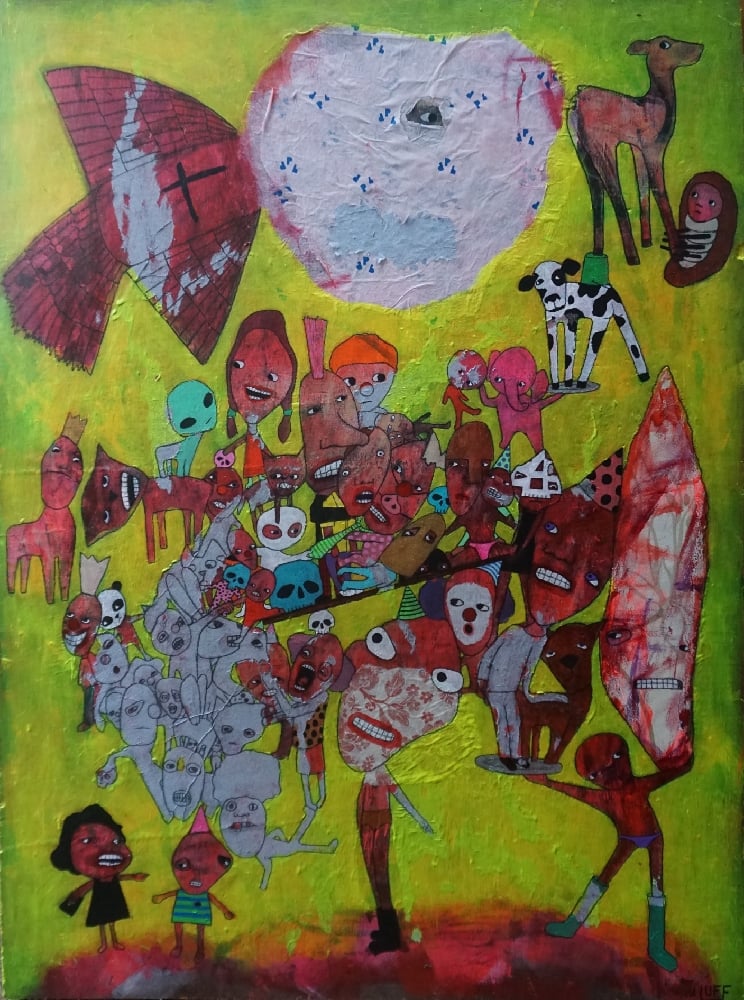 Acyrlic, paper towel, wallpaper, tissue paper on recycled plywood